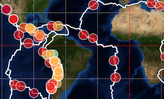 : quakes near the surface are red, deeper quakes are yellow to blue.