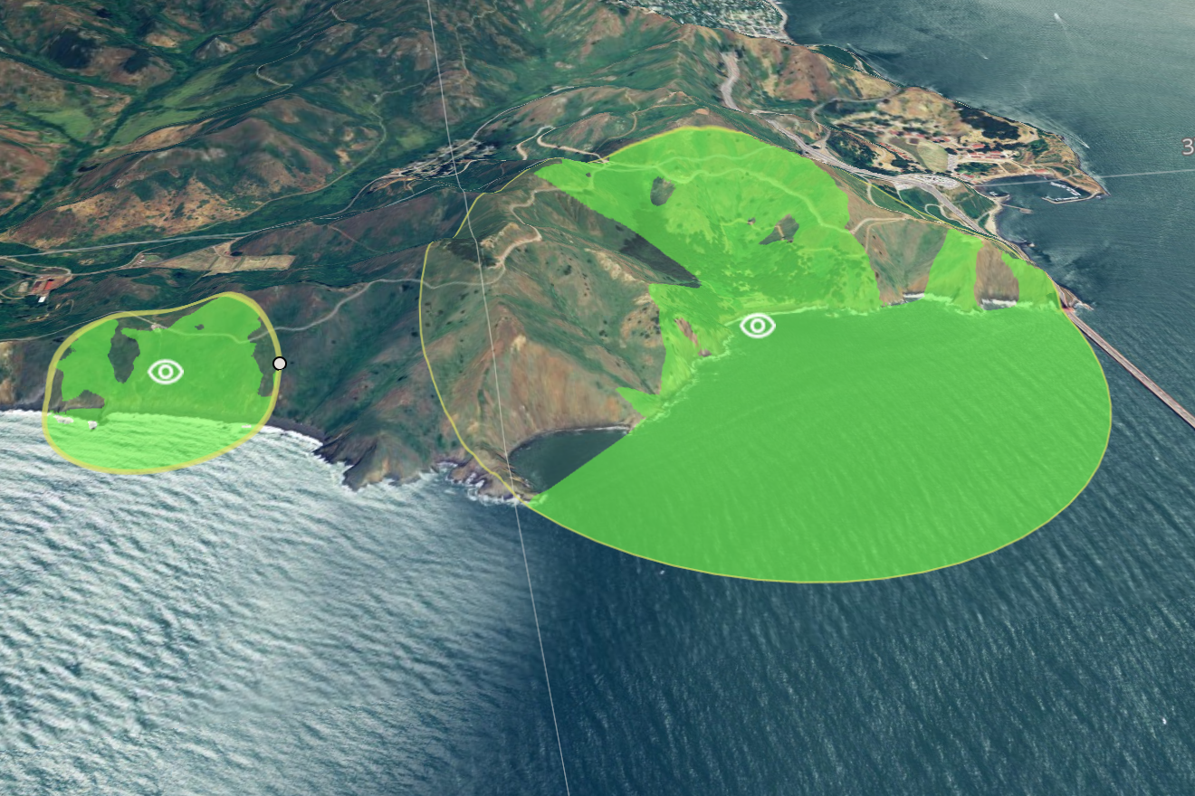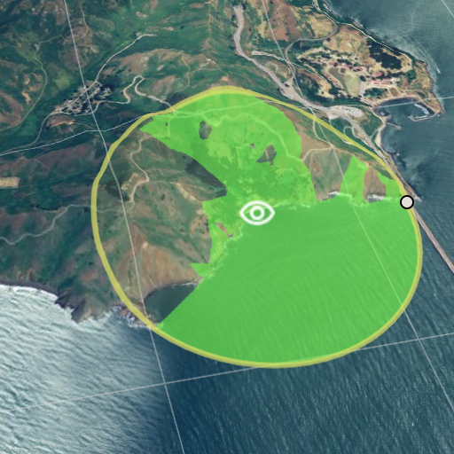 The first button at the top left of the toolbar allows to create new observers. Existing observers can be selected, moved and resized, using the handles. Selected observers can be removed either by pressing the backspace or delete key, or by clicking the second button on the toolbar. Selected observers can be deselected by pressing the escape key. Added observers are positioned 10 meters above the terrain. In this sample, the line-of-sight coverage is limited to a radius of at most 60 kilometers.